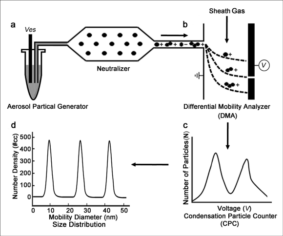 电迁移率-粒径分布-计数的蛋白质含量装置工作流程图 基于电迁移率-粒径分布-计数的蛋白质含量装置实物图 搭建了基于电迁移率-粒径分布-计数的蛋白质含量计量装置,该装置由气溶胶颗粒发生器、粒子分选器(即DMA)和凝结核颗粒计数器组成,通过该装置可实现直接测定蛋白质浓度,不依赖于外标和内标。